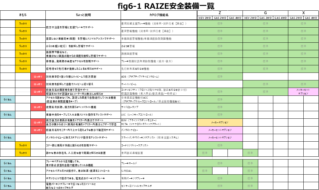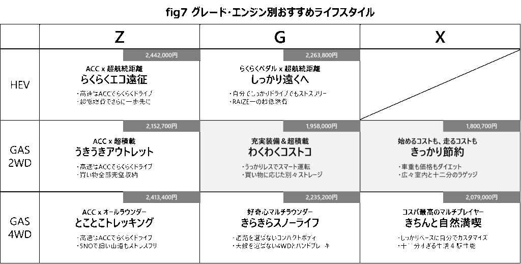 RAIZEは、グレードごとに特徴がはっきりしているため、ライフスタイルに合わせた選び方が可能です。